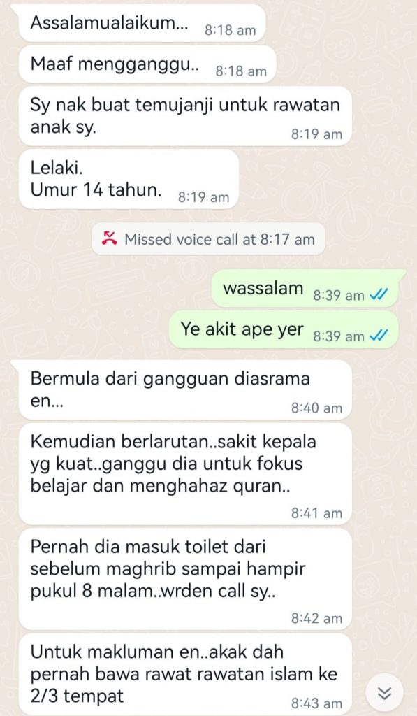 Gangguan Saka Penyebab Pelajar Tahfiz Susah Hendak Menghafal. Pesakit ini telah datang jauh dari kuala selangor untuk mendapatkan rawatan dari saya. Ibu pesakit merupakan kakak kepada kenalan ditempat kerja lama saya. Dia dah berpindah ke luar daerah, saya pun sama. Pesakit merupakan pelajar tahfiz di madrasah moden xsilap saya. Beliau dah hafal sehingga juz 10. […]
